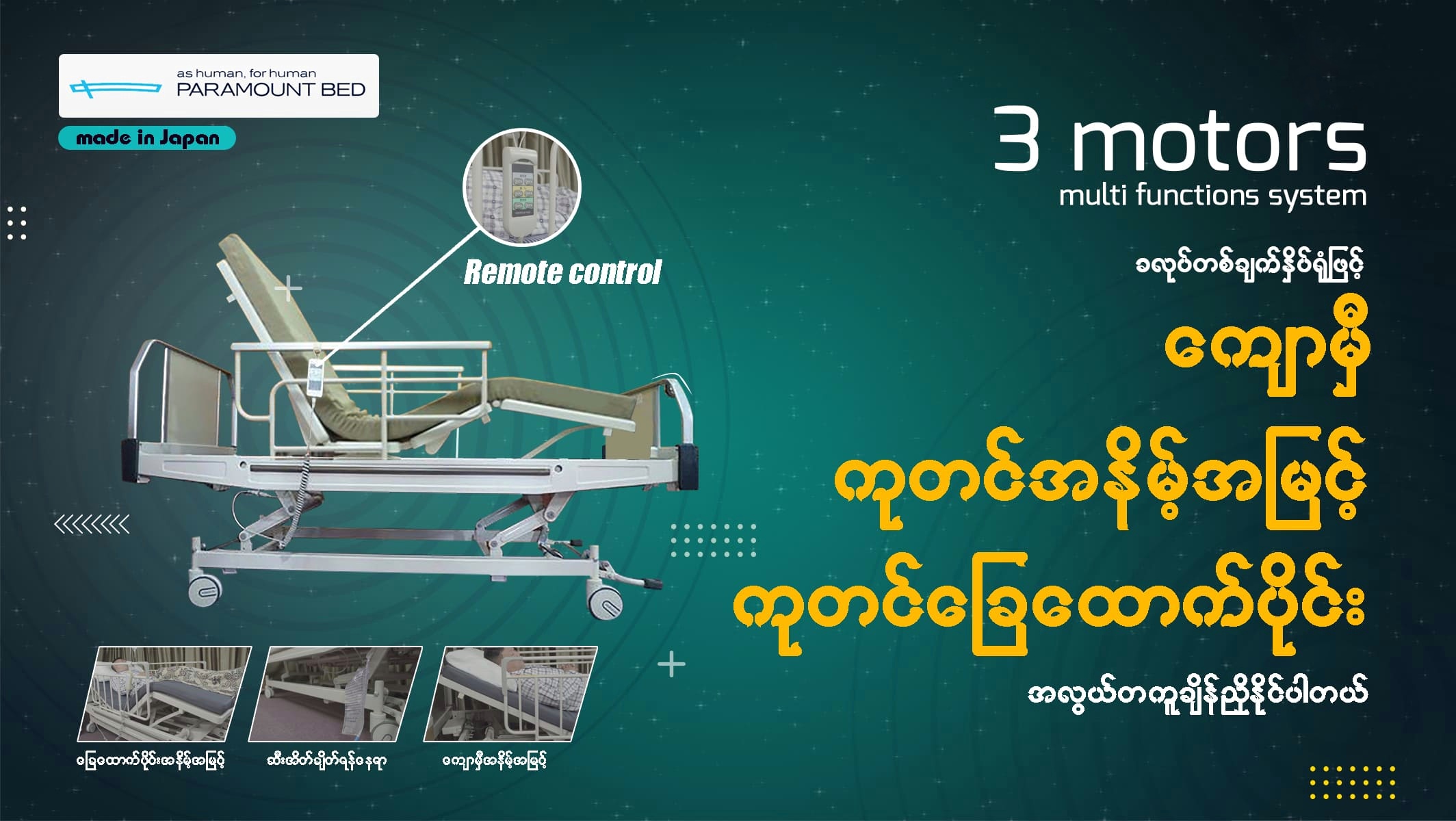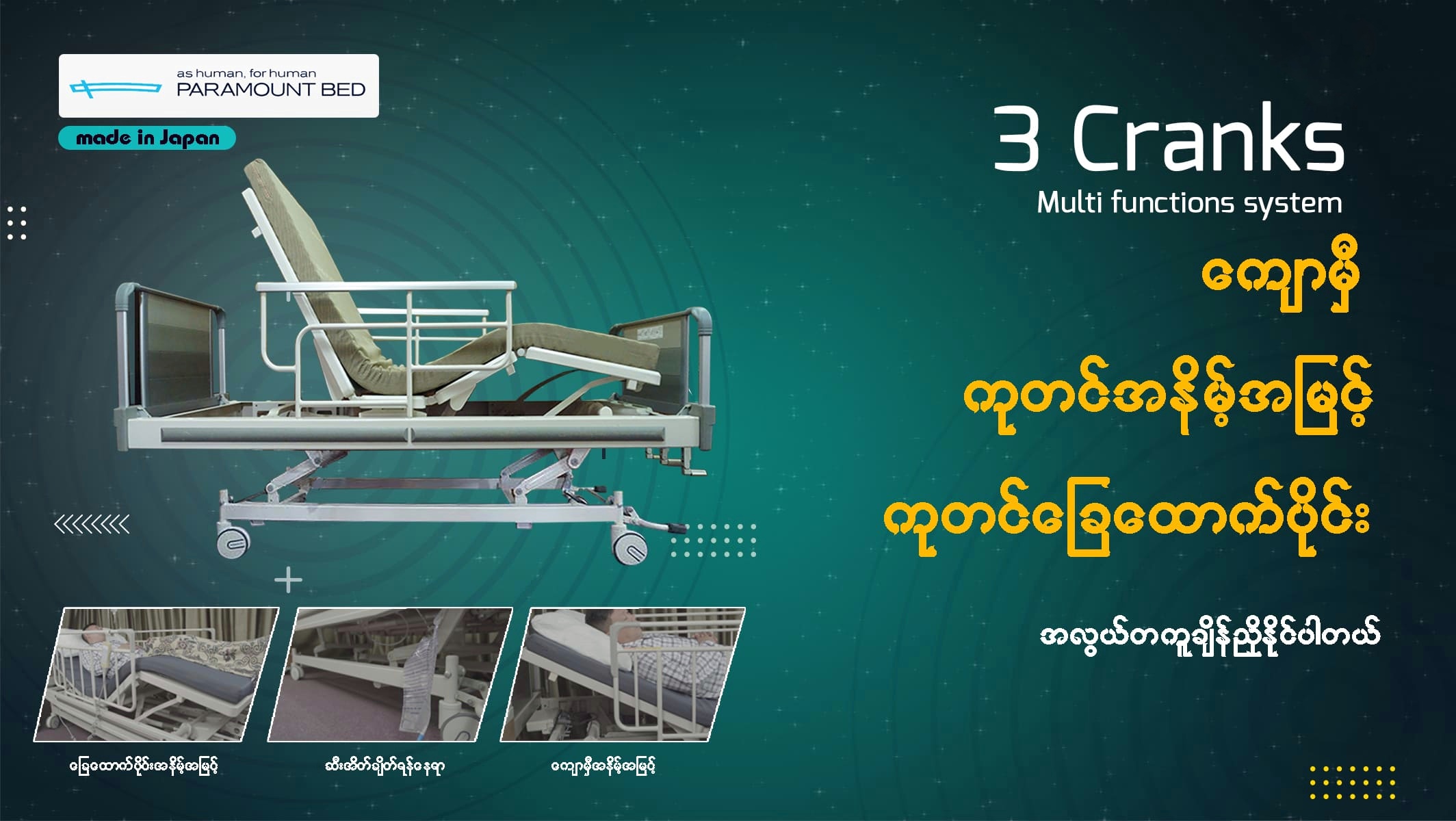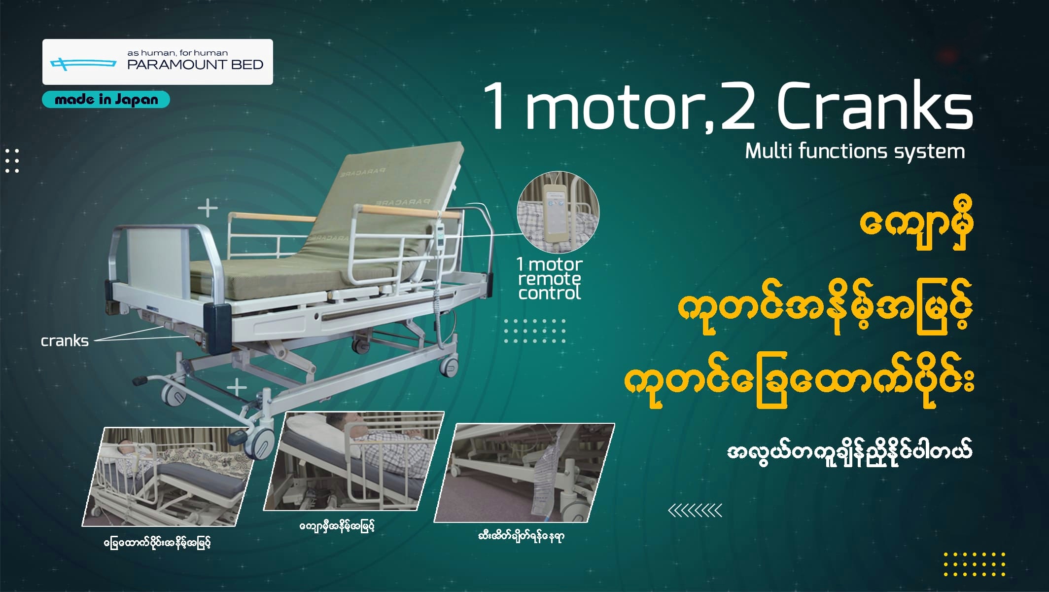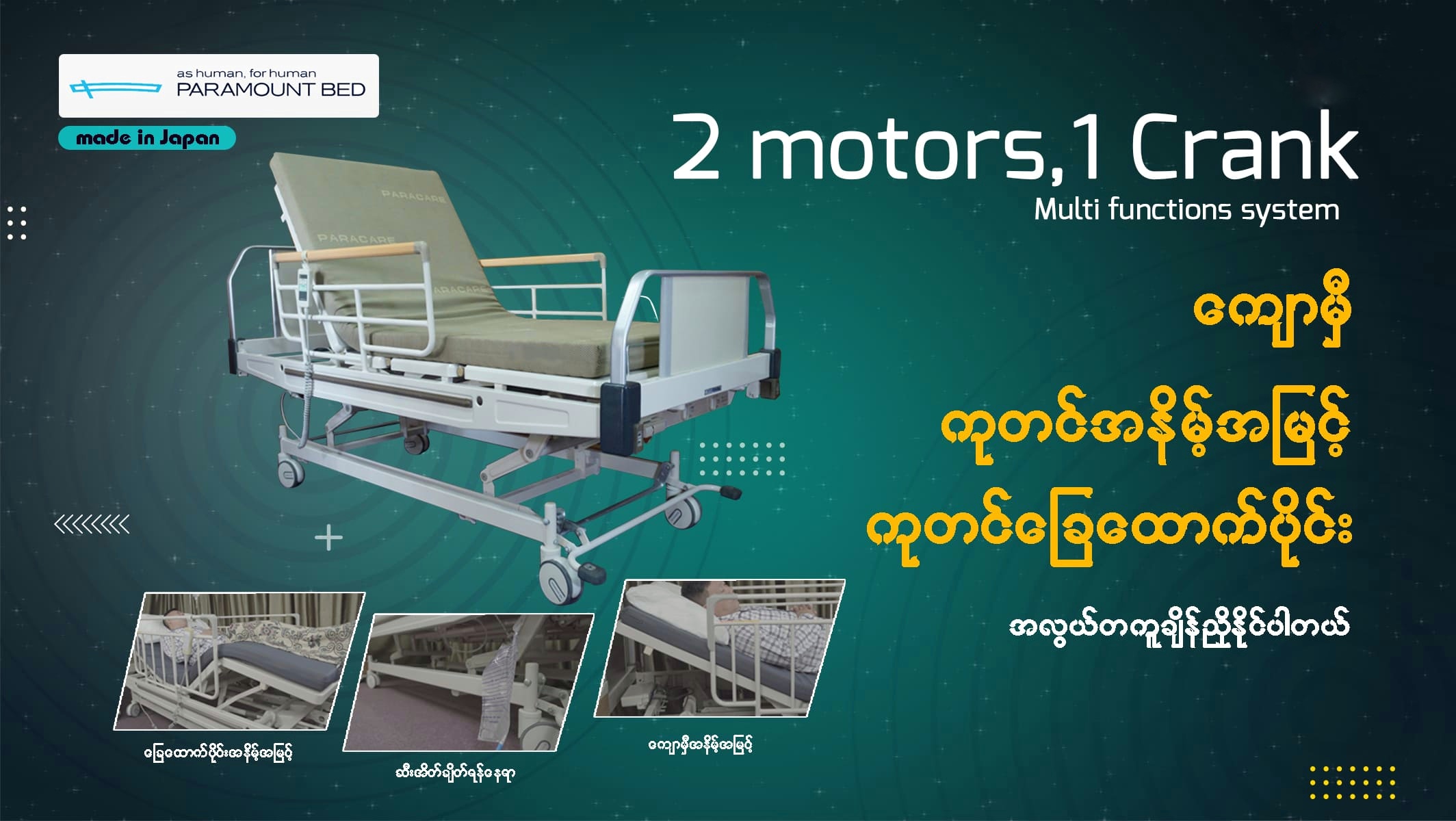 ဖြုတ်ရတပ်ရလွယ်ကူပြီး ဆေးရုံမှာပဲသုံးသုံး အိမ်မှာပဲသုံးသုံး သုံးရတာလည်းအဆင်ေပြစေတဲ့အပြင် ဂျပန်နိုင်ငံမှတင်သွင်းထားတဲ့ Paramount အမှတ်တံဆိပ် အာမခံ ၃ နှစ်ပါရှိတဲ့ 2 Motor 1 Crank ကုတင်အမျိုးအစားလေးနဲ့မိတ်ဆက်ပေးပါရစေရှင့်