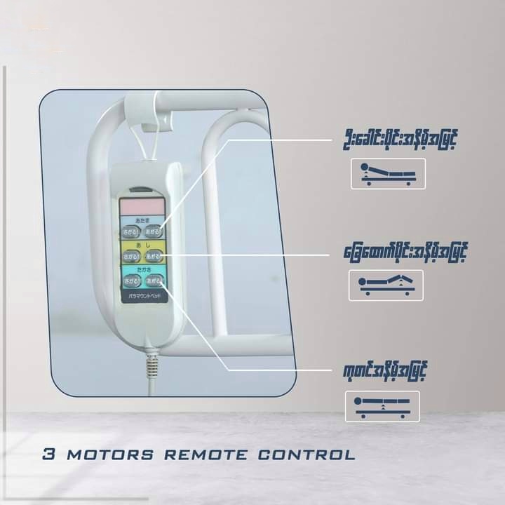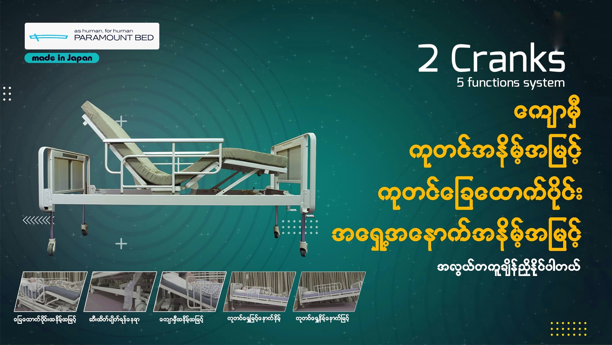 ဂျပန်နိုင်ငံမှ တင်သွင်းထားတဲ့ အရည်အသွေးပြည့်မှီပြီး အာမခံ ၃ နှစ်ပါရှိသော Paramount အမှတ်တံဆိပ် လုပ်ဆောင်ချက် 5 မျိုး ပါဝင်တဲ့ 2 Crank ( 5 Function ) ကုတင် အမျိုးအစားလေး နဲ့ မိတ်ဆက်ပေးလိုက်ပါတယ်ရှင့်
